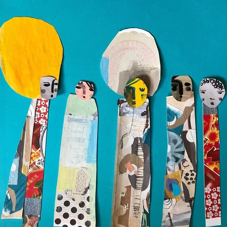 Grab some old work you have saved or create some new pages before class. These will be pieces you are willing to cut up. You may use paint, markers, colored pencils, collage, or mixed media!