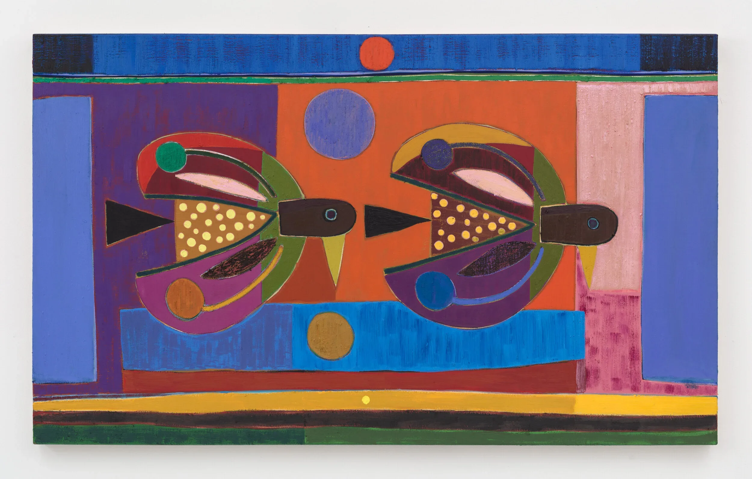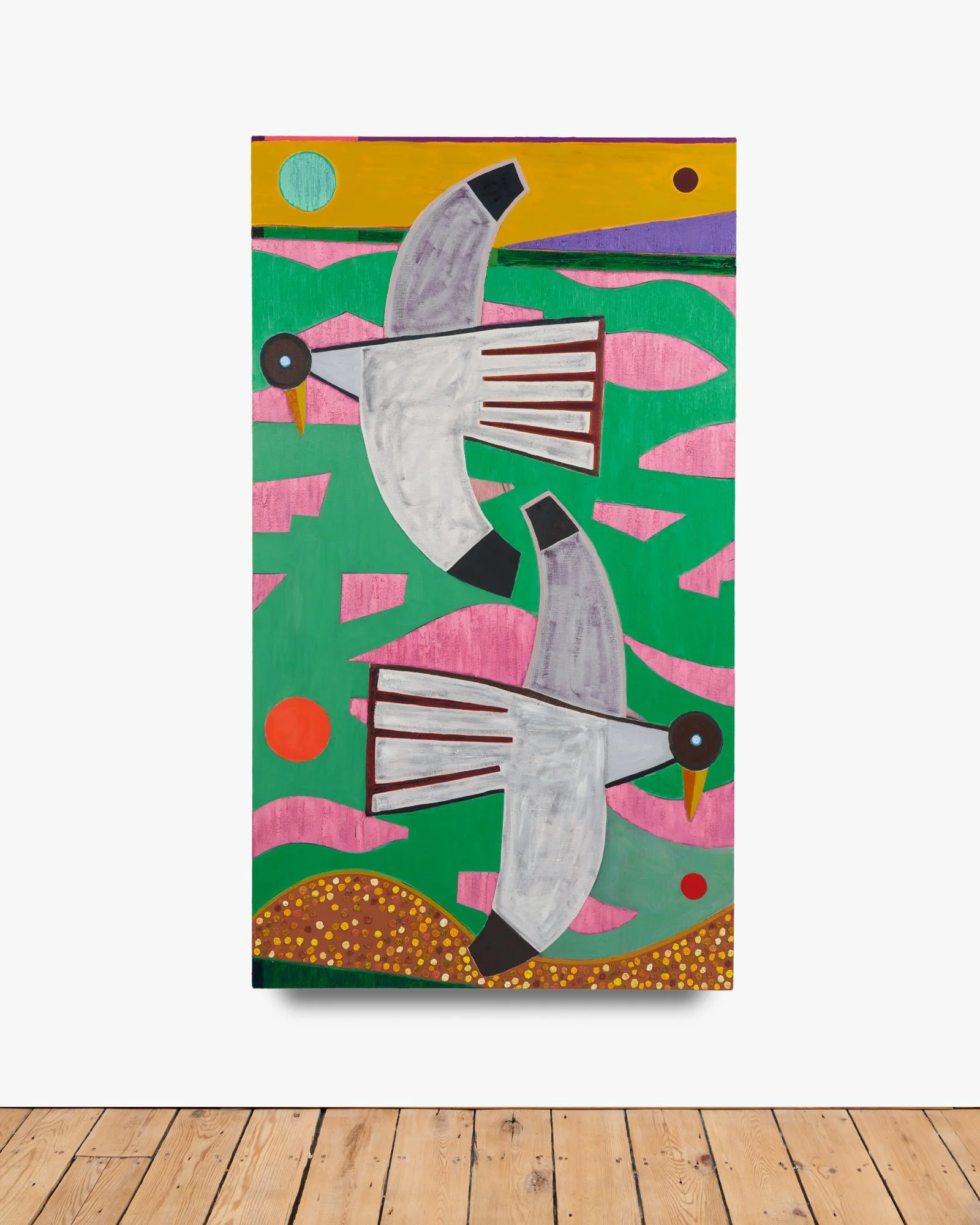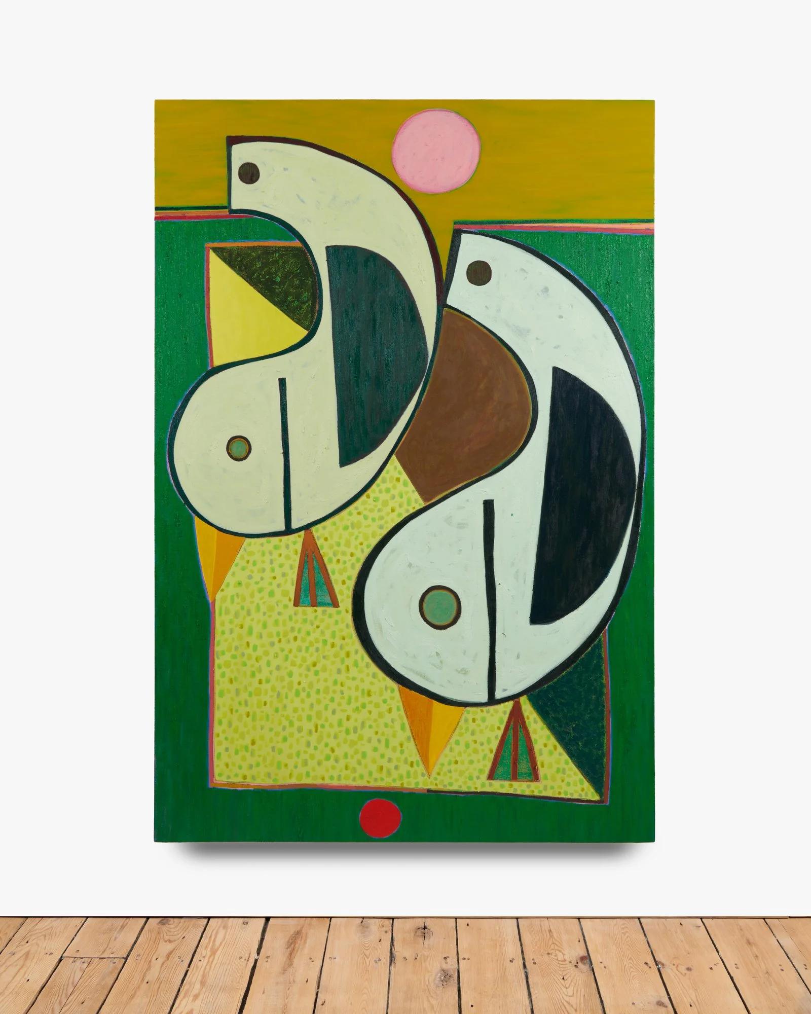 Brooklyn-based Austin Eddy’s paintings call on the viewer to create their own stories out of the ones he proposes. He might use autobiographical events and abstract them to birds, but never imposes his own interpretation. His birds are more form than animal: they are stand-ins for the very human desire for personal freedom, framed by its equally strong wish for stability and structure. As his work toes the line between figurative and abstract, it recalls the cubist forms of the 20th century, while being firmly anchored in Austin’s present.