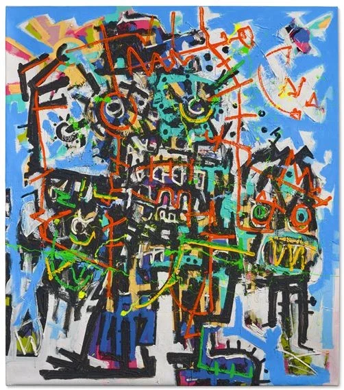 Indonesian outsider artist Fika Leon is often inspired by memories from his past experiences. He depicts this energy and emotion in his brushstrokes, layered thick paint, sometimes whimsical, sometimes aggressive figures stacked like totems with large features and dance-like movement to reflect these memories.