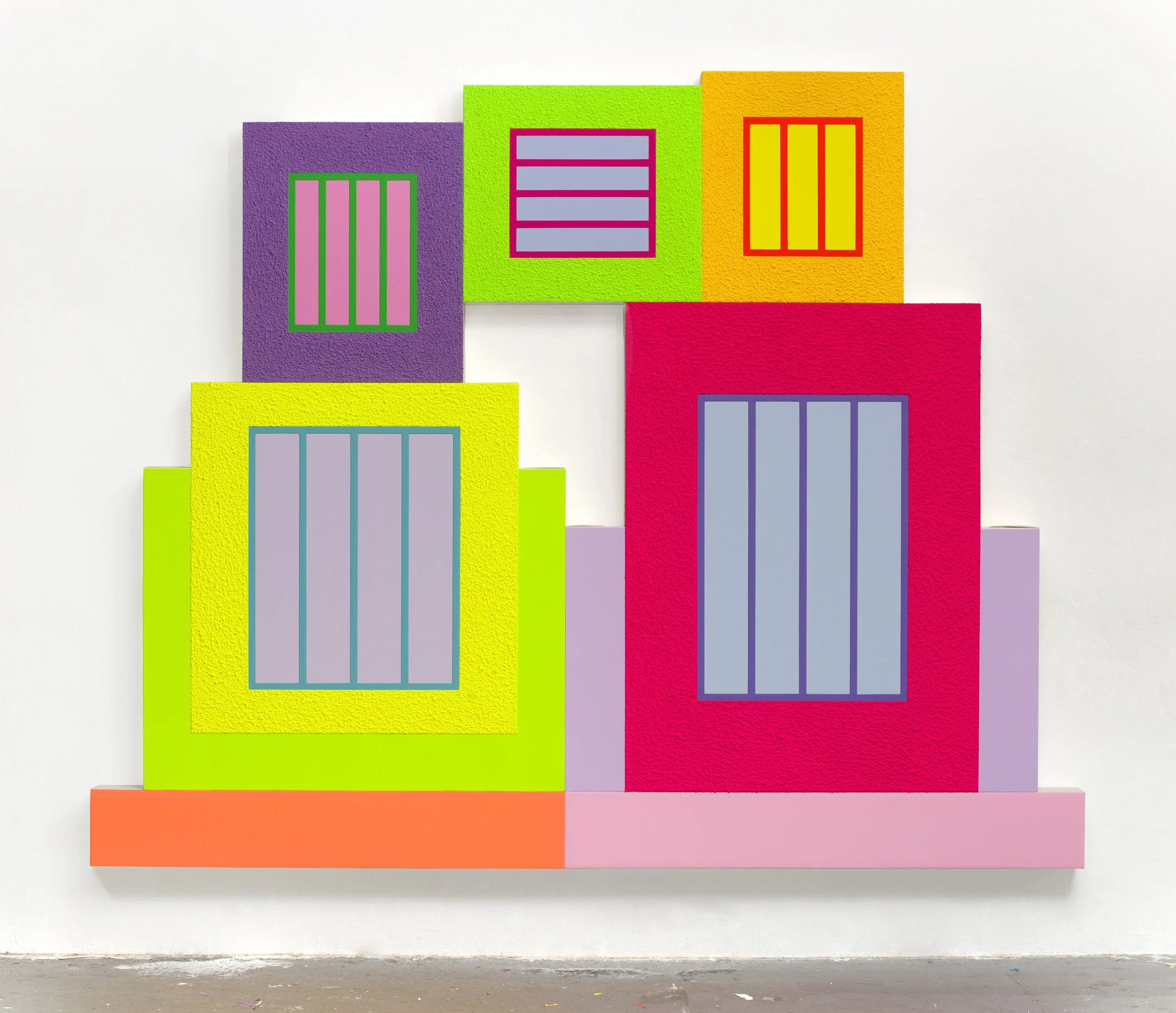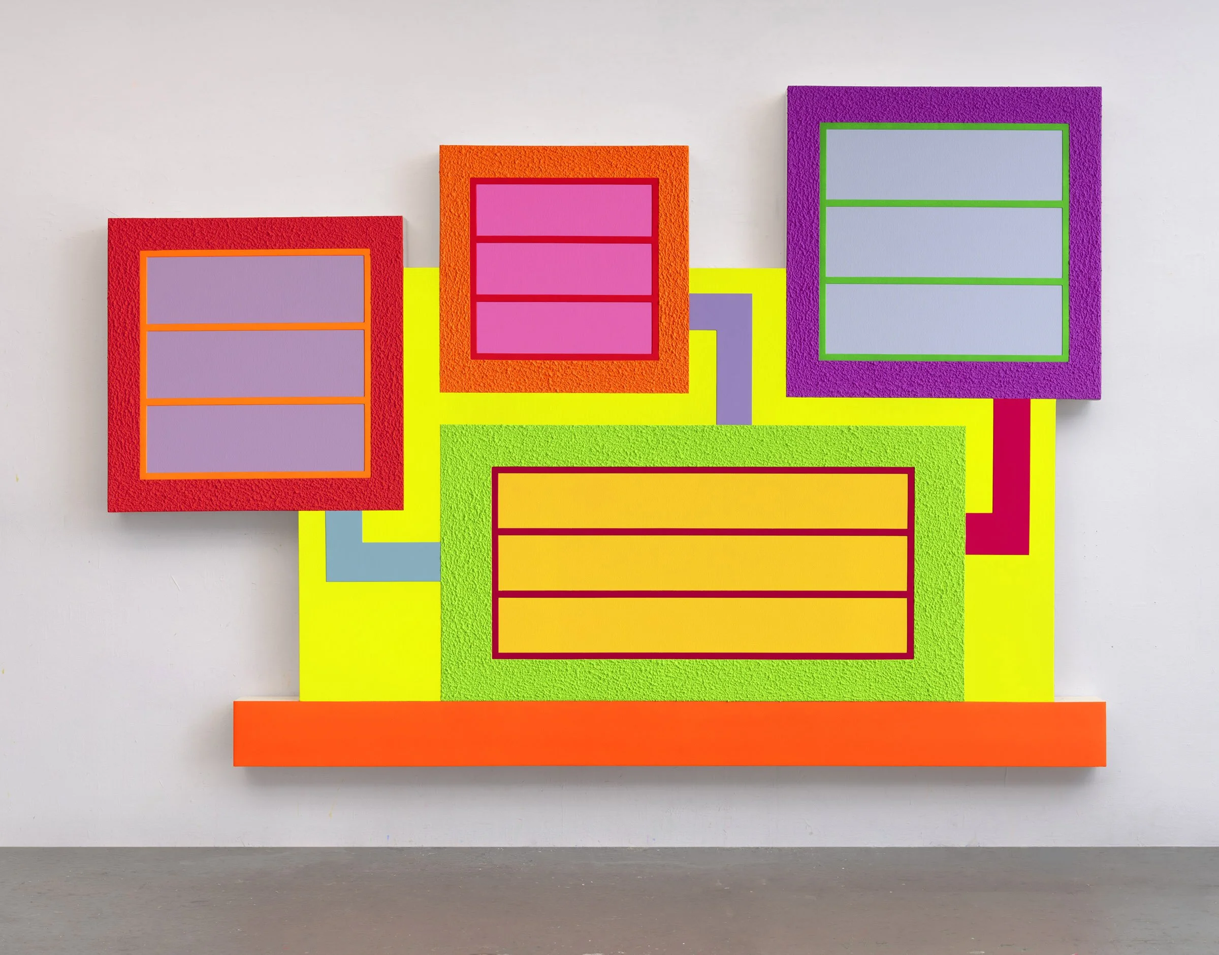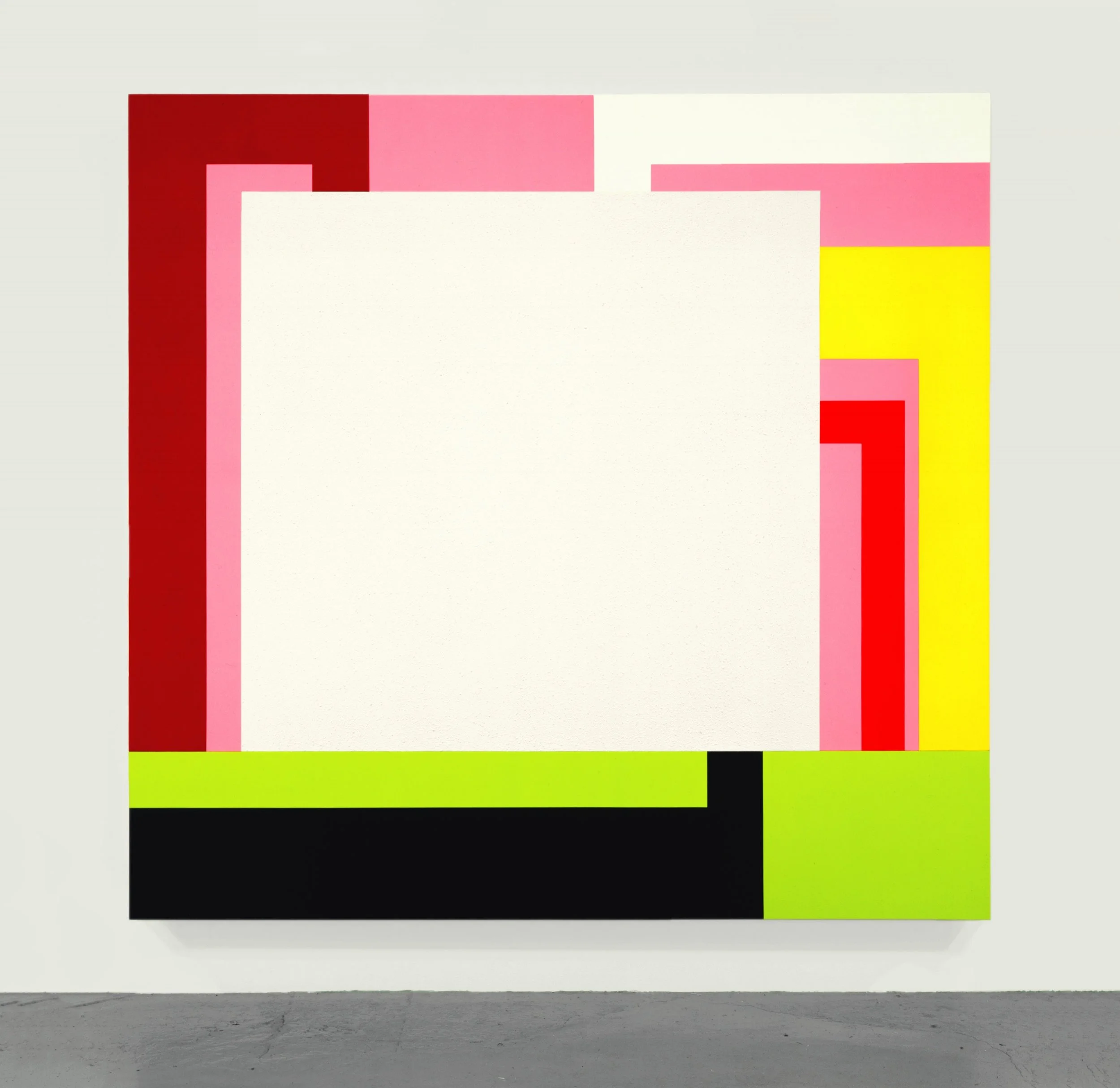 Acrylic, fluorescent acrylic, Flashe and Roll-a-Tex on canvas