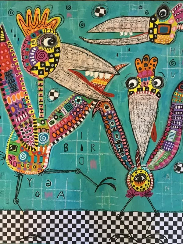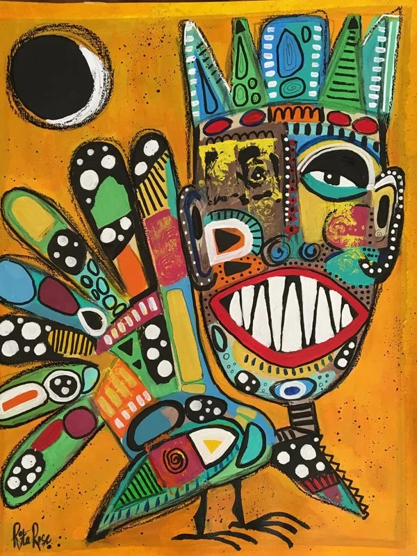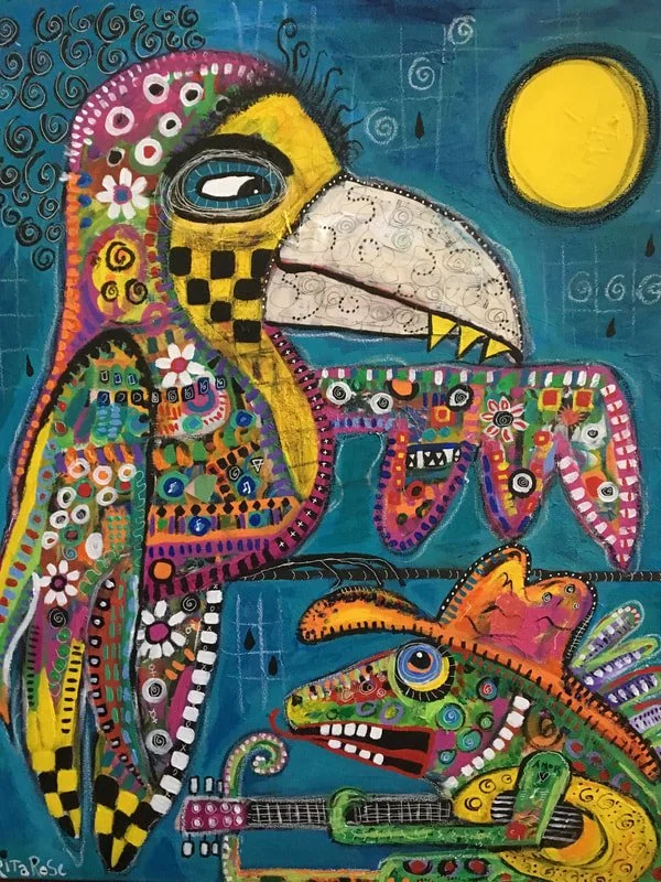 Rita is considered one of the greatest "naive" art masters of her time. Formally trained on the back streets of San Clemente, cutting her teeth on canvasses covered with acrylic, Rita began drawing a crow with some ketchup packets on a napkin and was immediately signed by a prominent Laguna Beach gallery. By the time she was 52, she had graduated to inks and the use of multi-media. Ok, maybe her husband wrote this bio, but it sounds pretty good, right?